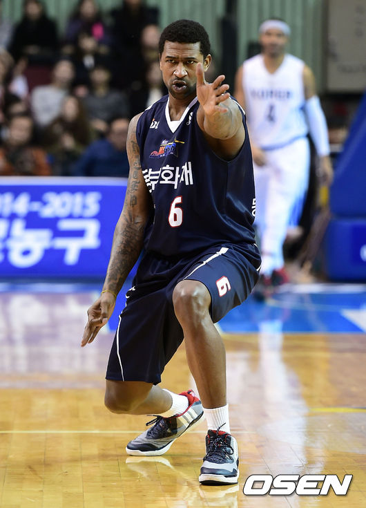 10일 오후 서울 잠실실내체육관서 열린 2014~15 KCC 프로농구 올스타전 첫날 KBL선발팀과 인천AG 국가대표팀의 경기,3쿼터 KBL대표팀 전태풍의 역전 3점슛때 포웰이 세리머니를 하고 있다.