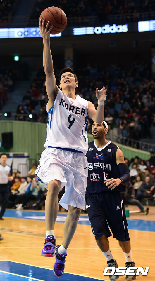 10일 오후 서울 잠실실내체육관서 열린 2014~15 KCC 프로농구 올스타전 첫날 KBL선발팀과 인천AG 국가대표팀의 경기,3쿼터 김선형이 레이업슛을 성공시키고 있다.