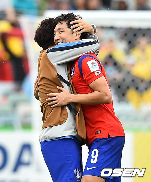 전반 종료 후 선제골을 성공시킨 한국 조영철이 동료와 환호하고 있다.