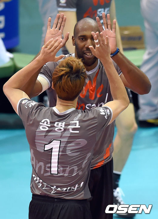 승리를 거둔 OK저축은행 송명근과 시몬이 하이파이브를 하고 있다. / youngrae@osen.co.kr