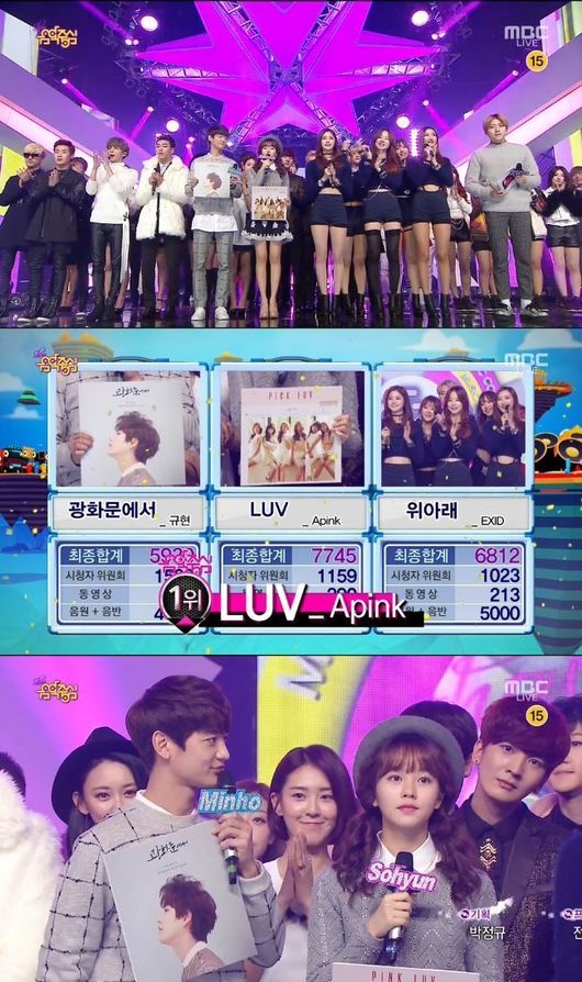 에이핑크는 10일 오후 방송된 MBC '쇼!음악중심'에서 규현과 EXID를 제치고 1위를 차지했다.