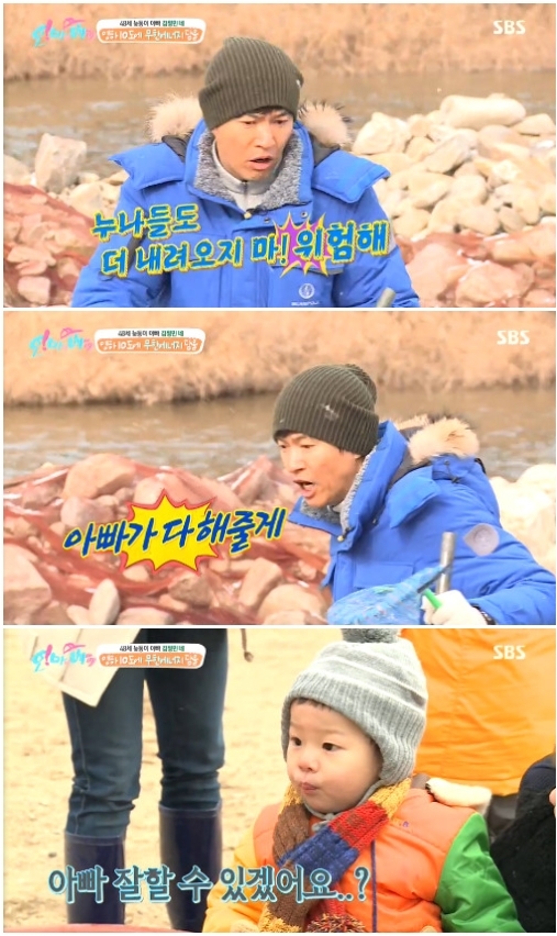 이날 김정민은 장어와 메기 잡이에 나섰고 "아빠가 다 잡아줄게"라며 허세를 부렸다. 얼음물에 입수한 김정민은 "춥다" "맹물에서 잡는 것 보다 더 어렵다" 등 불평하기도 했지만, 다행히 기절한 장어와 메기를 잡을 수 있었다.