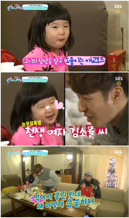 이날 김태우의 첫째 딸 소율이는 손호영 곁에서 떠나지 않았다. 입이 짧은 소율이었지만 손호영이 스테이크 한 조각을 내밀자 기꺼이 받아 먹었다. 급기야 어깨를 으쓱거리며 애교를 선보였다. 이에 김태우의 아내 김애리씨는 김태우에게 "우리한테 소율이가 어깨 으쓱한 적 있어요?"라며 씁쓸해했다. 김태우는 "딸 자식 키워서 소용없다"고 불평했다.
