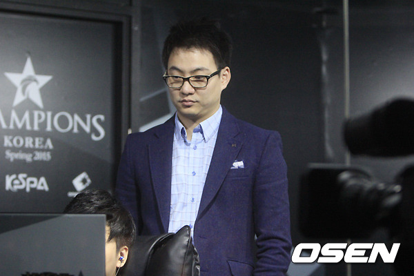 10일 오후 서울 용산 온게임넷 e스포츠 상설경기장에서 '2015 LOL 챔피언스(이하 롤챔스)' 코리아 스프링 3회차 1경기 나진 e엠파이어와 KT 롤스터의 경기가 열렸다. KT 이지훈 감독이 정글러 '스코어' 고동빈이 챔피언 픽하는 장면을 지켜보고 있다.