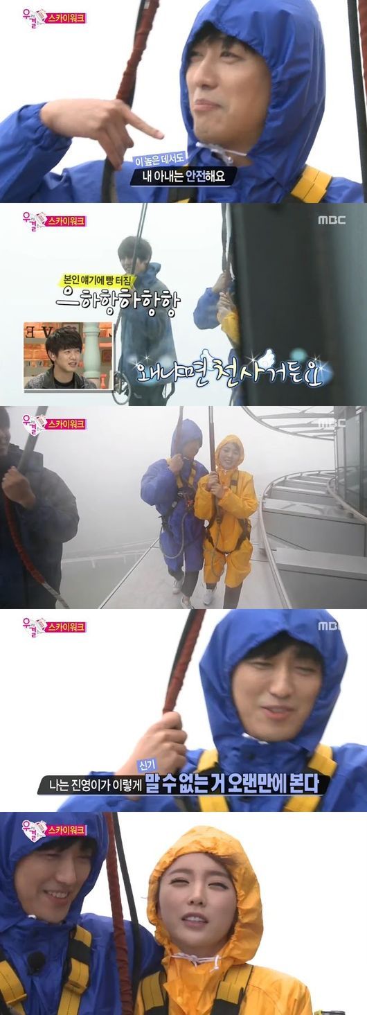 남궁민은 10일 오후 방송된 MBC 예능프로그램 '우리 결혼했어요'(이하 '우결')에서 홍진영과 함께 스카이워크를 타던 중 옆에 있던 가이드에게 영어로 "내 아내는 안전하다"고 말을 걸었다.