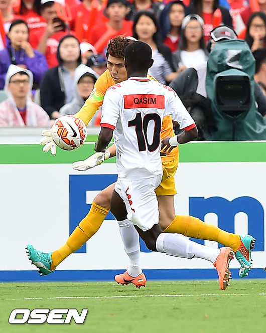 한국 김진현이 달려나와 볼을 잡아내고 있다. / rumi@osen.co.kr