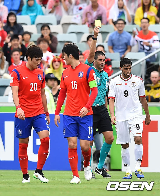 한국 오만 선수들이 옐로우 카드를 받고 있다. / rumi@osen.co.kr