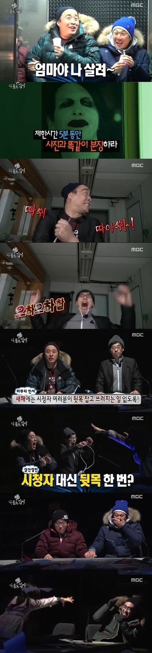 이어 뉴스룸에서는 앵커가 돼 보도 멘트를 읽어야하는 미션이 주어졌다. 멘트를 읽는 도중 그 내용에 맞춰 뒤에서 위에서 앞에서 이들을 놀라게 하는 기구와 형상(?)들이 툭툭 튀어나왔다. 정준하와 유재석은 그야말로 혼비백산했다. 정형돈과 하하는 두 손을 꼽 잡은 채 멘트를 읽어내리는 진풍경(?)을 연출했다. 눈치가 빠른 박명수 역시 알고도 피할 수 없었다. 속수무책 당하고 놀라는 멤버들의 외모는 그야말로 굴욕.