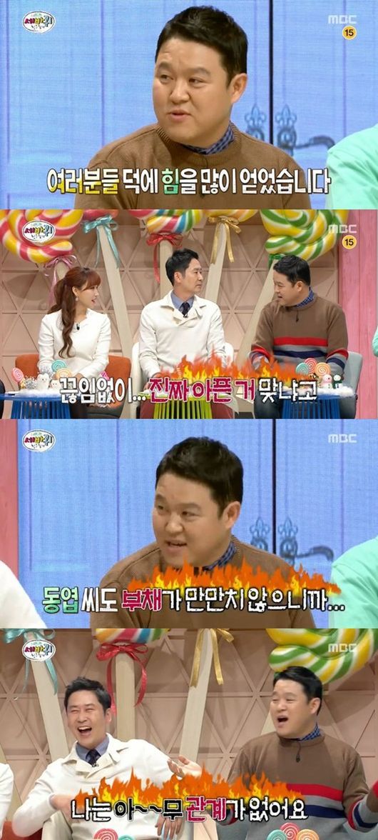 김구라는 "그래도 위안이 됐다. 동엽이도 부채가 만만치 않으니까. 그래도 얘는 지가 한거고, 나는 아무것도 한 것이 없다"고 말해 웃음을 자아냈다.