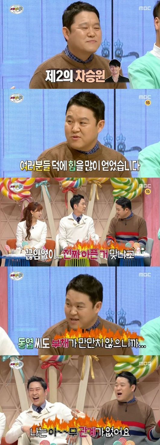 김구라는 "그래도 위안이 됐다. 동엽이도 부채가 만만치 않으니까. 그래도 얘는 지가 한거고, 나는 아무것도 한 것이 없다"고 말해 웃음을 자아냈다.
