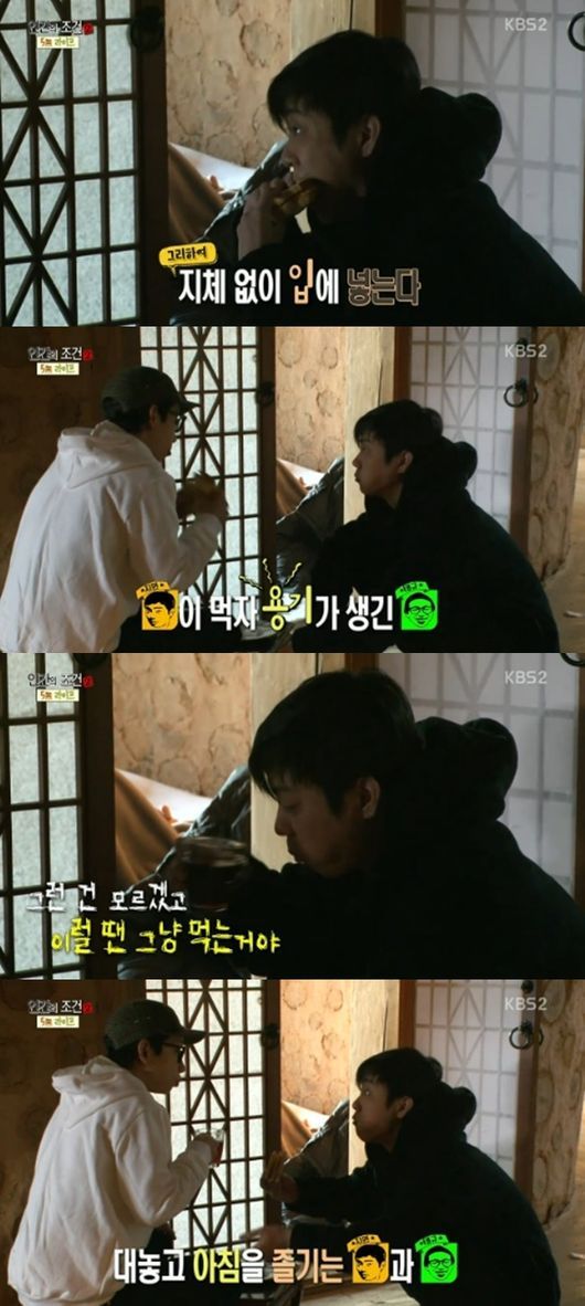 하지만 예능 고수 은지원은 “하나만 있는 건 먹어도 된다. 여섯 개가 있으면 먹으면 안 되는 건데, 하나는 괜찮다”는 예능의 법칙과 이것을 두고 싸우라는 제작진의 의도를 설명하며 봉태규와 함께 토스트를 나눠먹었다.