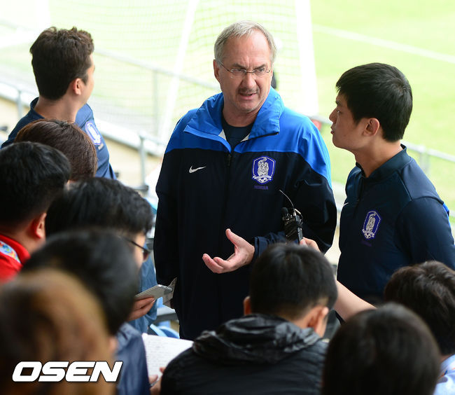11일 오후(이하 한국시간) 호주 캔버라 맥켈러 파크에서 열린 한국 축구대표팀 회복 훈련에서 슈틸리케 감독이 취재진들과 인터뷰를 하고 있다.