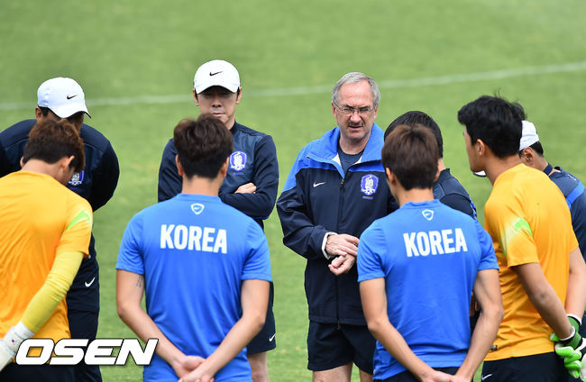 11일 오후(이하 한국시간) 호주 캔버라 맥켈러 파크에서 열린 한국 축구대표팀 회복 훈련에서 슈틸리케 감독이 선수들과 미팅을 갖고 있다.
