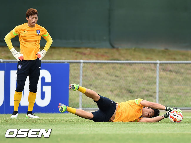 11일 오후(이하 한국시간) 호주 캔버라 맥켈러 파크에서 열린 한국 축구대표팀 회복 훈련에서 정성룡과 김승규가 수비훈련을 하고 있다.