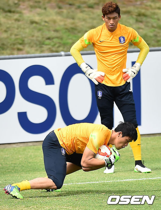 11일 오후(이하 한국시간) 호주 캔버라 맥켈러 파크에서 열린 한국 축구대표팀 회복 훈련에서 정성룡이 김승규 앞에서 수비훈련을 하고 있다.