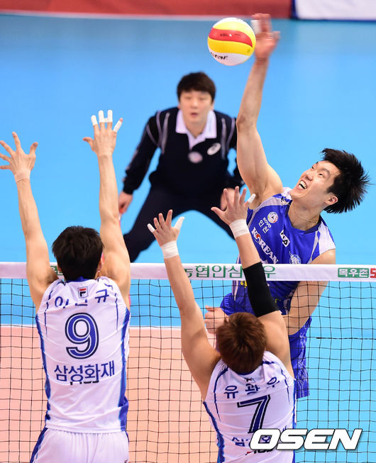 11일 오후 대전충무체육관에서 열린 '2014-2015 NH농협 V-리그' 삼성화재와 대한항공의 경기 1세트 신영수가 공격을 시도하고 있다.
