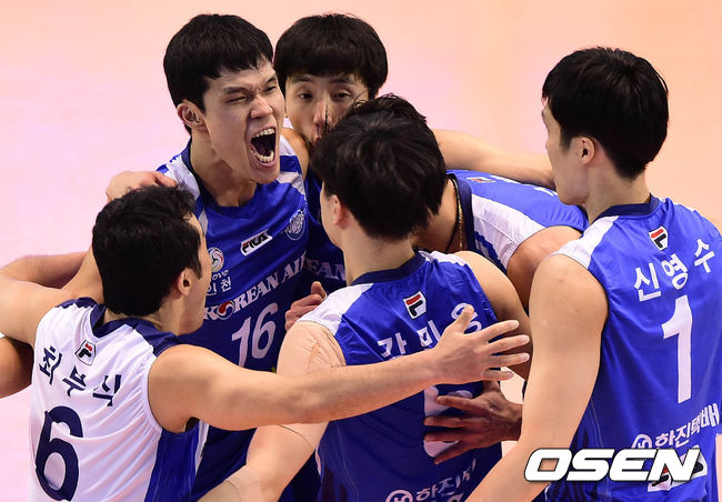 11일 오후 대전충무체육관에서 열린 '2014-2015 NH농협 V-리그' 삼성화재와 대한항공의 경기 2세트 대한항공 선수들이 득점 후 기뻐하고 있다.
