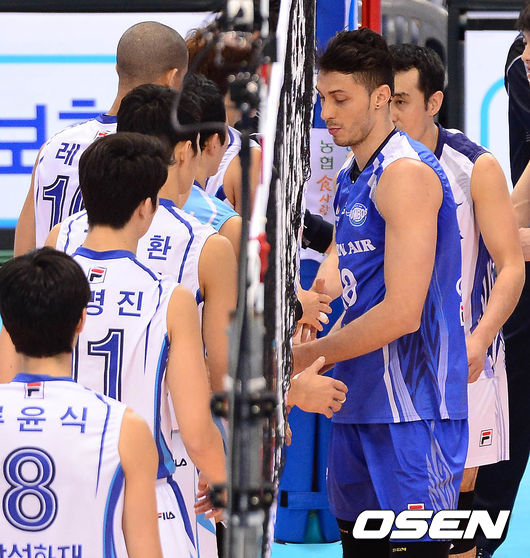 11일 오후 대전충무체육관에서 열린 '2014-2015 NH농협 V-리그' 삼성화재와 대한항공의 경기 종료 후 산체스가 삼성화재 선수들과 인사를 나누고 있다.