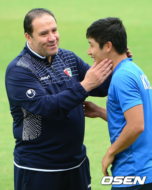 11일 오후(이하 한국시간) 호주 캔버라 맥켈러 파크에서 열린 한국 축구대표팀 회복 훈련에서 나빌 말룰 쿠웨이트 감독이 이근호와 얘기를 나누고 있다.