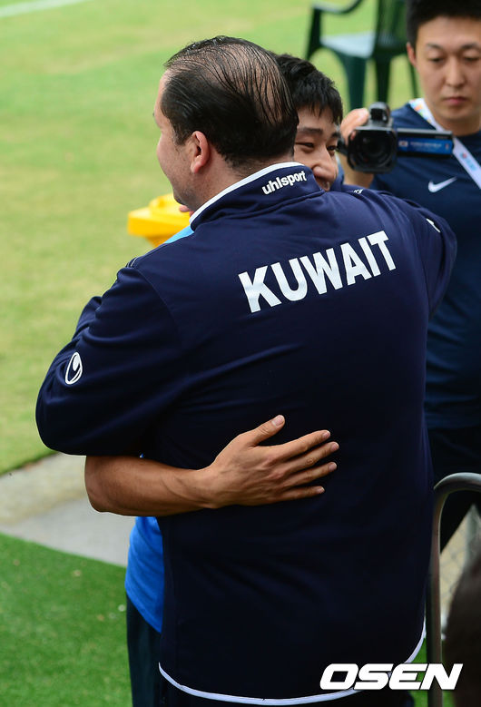 11일 오후(이하 한국시간) 호주 캔버라 맥켈러 파크에서 열린 한국 축구대표팀 회복 훈련에서 나빌 말룰 쿠웨이트 감독이 이근호과 포옹을 하고 있다.