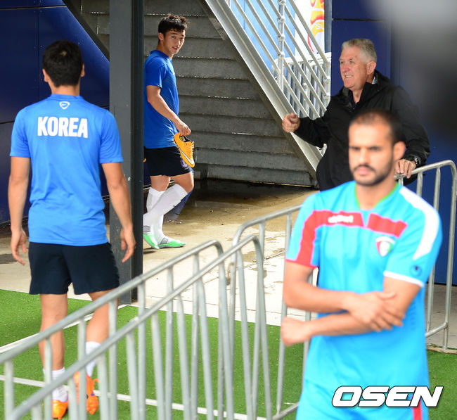 11일 오후(이하 한국시간) 호주 캔버라 맥켈러 파크에서 열린 한국 및 쿠웨이트 축구대표팀 훈련에서 훈련을 마친 김민우가 입장하는 쿠웨이트 선수들을 바라보고 있다.