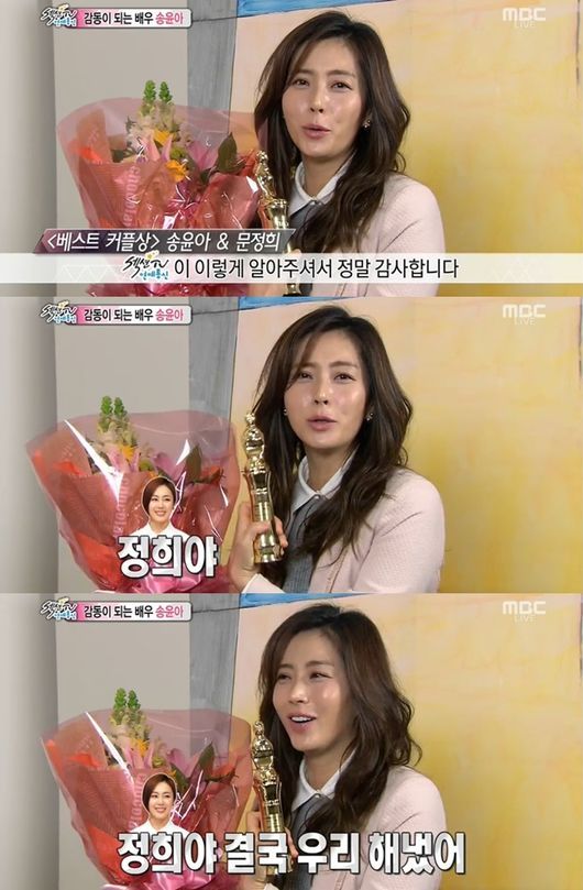송윤아는 11일 오후 방송된 MBC ‘섹션 TV 연예통신’에서 제작진에게 베스트 커플상 트로피를 받았다.
