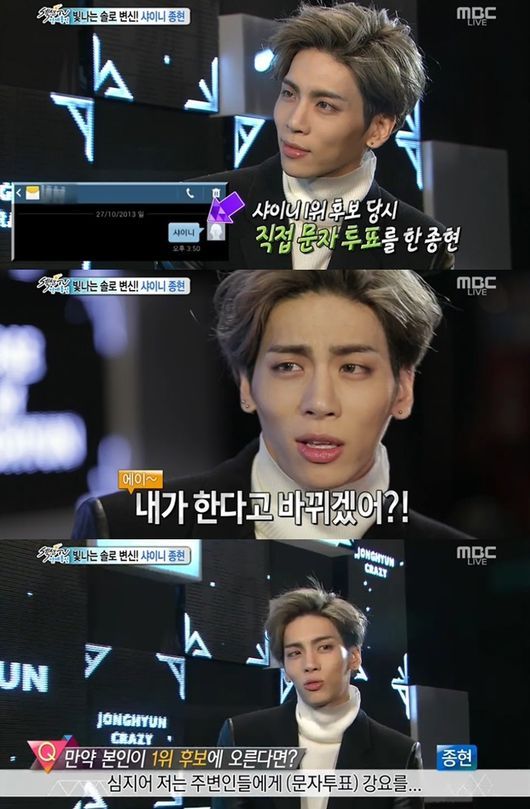 종현은 11일 오후 방송된 MBC ‘섹션 TV 연예통신’에서 “주변인들을 동원해 문자 투표할 것”이라고 말했다.