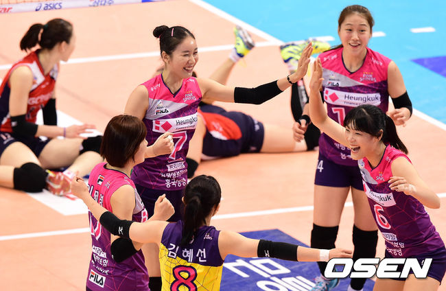 11일 오후 대전충무체육관에서 열린 '2014-2015 NH농협 V-리그' 인삼공사와 흥국생명의 경기 2세트 흥국생명 선수들이 득점 후 환호하고 있다.