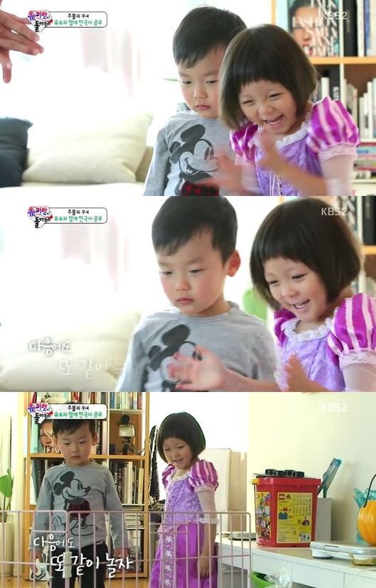 한편 '슈퍼맨이 돌아왔다'에는 추성훈 딸 사랑, 이휘재 쌍둥이 아들 서언 서준, 송일국과 세쌍둥이 아들 대한 민국 만세 등이 출연하고 있다. 지난주부터는 새롭게 엄태웅의 딸 지온이 합류했다.