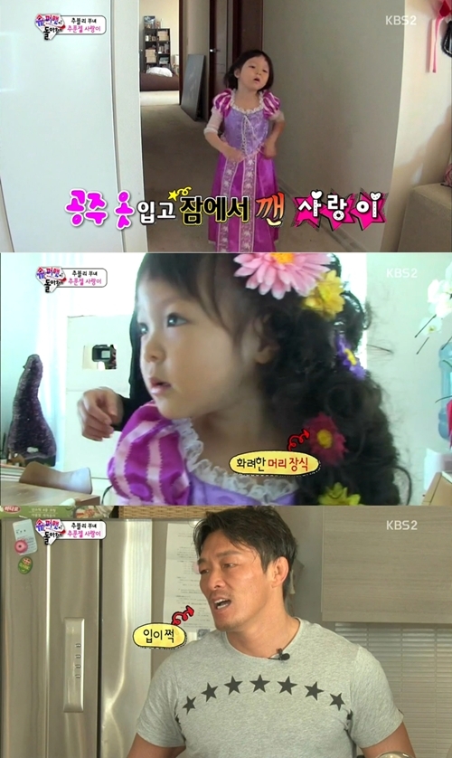 이날 사랑이 엄마 야노시호는 사랑이에게 라푼젤처럼 가발의 씌워 머리를 장식해줬다. 또 공주를 연상케 하는 옷을 입혔다. 날이갈수록 예뻐지는 사랑이의 미모가 눈길을 끌었다. 추성훈도 만족스러워하는 모습을 보였다.