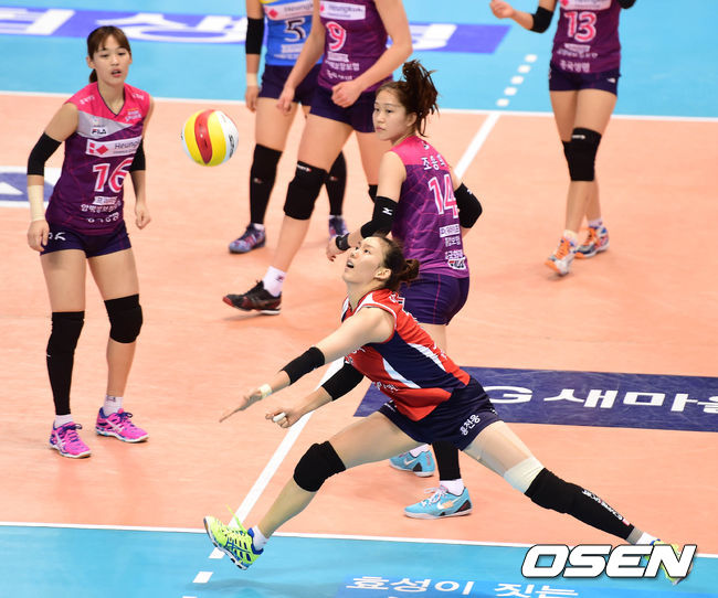 11일 오후 대전충무체육관에서 열린 '2014-2015 NH농협 V-리그' 인삼공사와 흥국생명의 경기 4세트 이연주가 상대편 코트로 공을 쫓아 가고 있다.