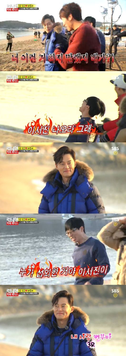 유재석은 11일 방송된 SBS 예능프로그램 ‘일요일이 좋다-런닝맨’(이하 ‘런닝맨’)에서 이서진에게 게임을 함께 하자고 제안했다. 하지만 이서진은 “또 하느냐?”라고 투덜거렸고, 유재석은 몸을 찰싹 달라붙어 “하자”라고 매달렸다.
