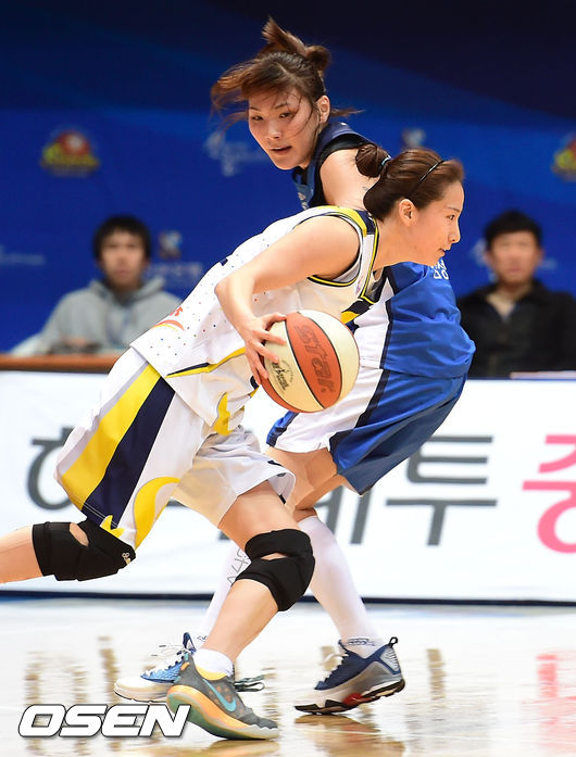11일 오후 인천 도원체육관에서 열린 'KB국민은행 2014-2015 여자프로농구' 인천 신한은행과 용인 삼성의 경기 1쿼터, 신한은행 곽주영이 삼성 최희진을 따돌리고 있다.