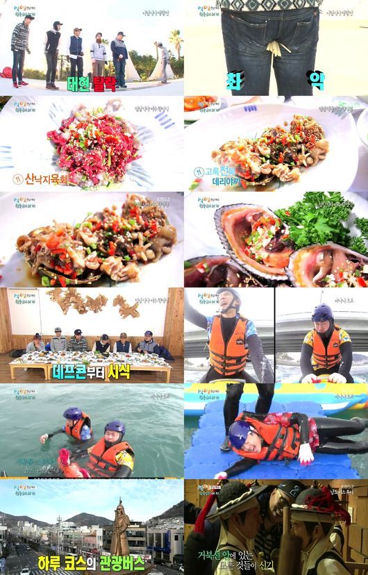 먹방부터 게임, 관광까지. 여수로 떠난 '1박2일'은 종합선물세트였다. 남도의 맛깔스런 해물부터 속고 속이는 게임, 땀내나는 도보 관광을 하면서 멤버들은 다양한 즐거움을 선사했다. 겨울바다에 입수하고 끝없이 가파른 계단을 오르면서도 웃음을 잊지않았다.