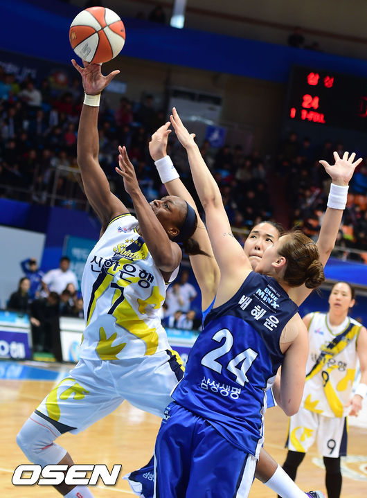 11일 오후 인천 도원체육관에서 열린 'KB국민은행 2014-2015 여자프로농구' 인천 신한은행과 용인 삼성의 경기 3쿼터, 신한은행 크리스마스가 삼성 배혜윤과 김계령 수비를 뚫고 골밑슛을 하고 있다.