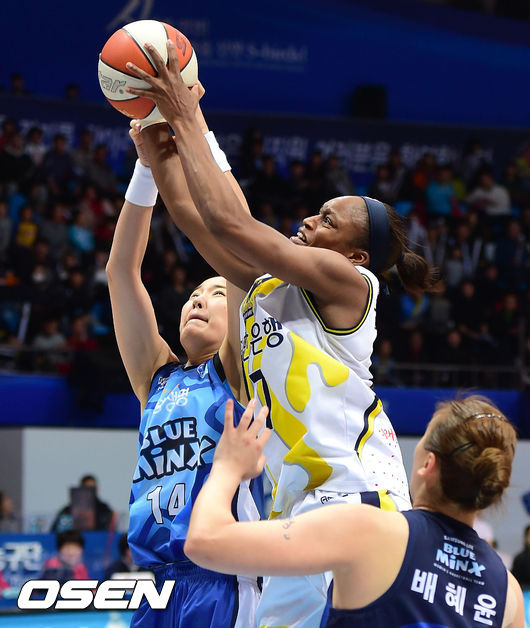 11일 오후 인천 도원체육관에서 열린 'KB국민은행 2014-2015 여자프로농구' 인천 신한은행과 용인 삼성의 경기 3쿼터, 신한은행 크리스마스와 삼성 김계령이 리바운드를 다투고 있다.