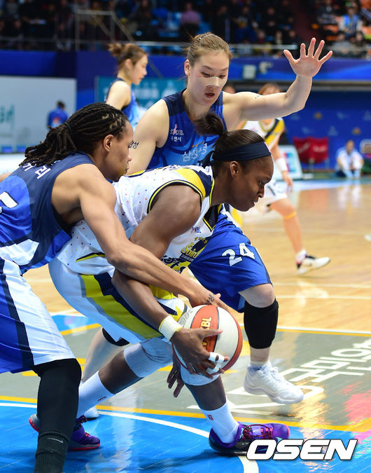 11일 오후 인천 도원체육관에서 열린 'KB국민은행 2014-2015 여자프로농구' 인천 신한은행과 용인 삼성의 경기 3쿼터, 신한은행 크리스마스가 삼성 커리와 배혜윤 수비에 막혀 넘어지려고 하고 있다.