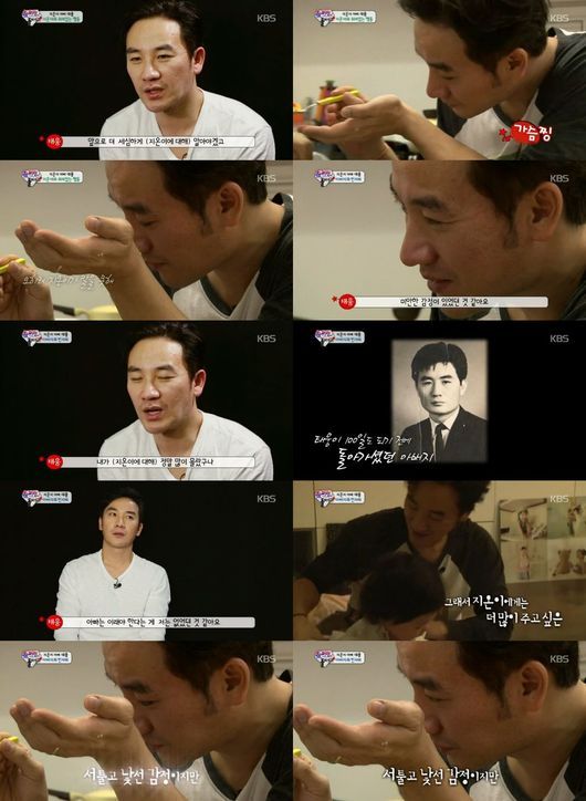 엄태웅의 눈물은 저녁식사 장면에서 터졌다. 지온이가 밥을 못먹고 있었는데, 이는 목이 말랐기 때문. 이를 뒤늦게 알아챈 그는 물을 마실 수 있게 해줬고, 그제서야 지온이는 맛있게 저녁을 먹기 시작했다. 이 모습을 보며그는 "아빠가 몰랐구나 이렇게 하고 싶은걸"이라며 울컥했고, 눈물을 보였다.