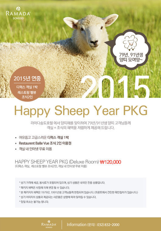 슈페리어룸 패키지는 15만 2400원(세금, 봉사료 포함)이며, 프리미어룸 패키지는 20만 원(세금, 봉사료 포함)에 이용 가능하다. 인천 송도에 위치한 라마다송도호텔에서도 2015년 청양의 해를 맞아 'Happy Sheep Year PKG'를 선보인다.