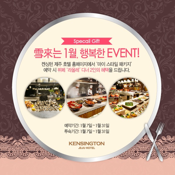 이와 더불어 1월 한 달간 마이 스타일 패키지를 홈페이지로 예약 시 월드 퀴진 뷔페 '라올레'의 디너 뷔페 2인을 제공하는 '설래(雪來)는 1월, 행복한 만찬' 이벤트를 진행한다.