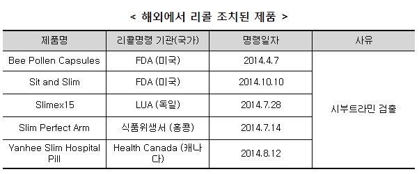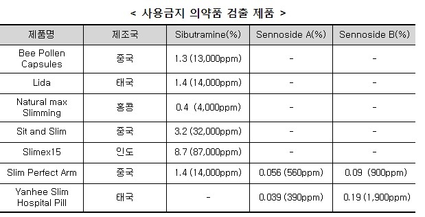 한국소비자원이 해외직구로 구입한 14개 다이어트 식품을 시험 검사한 결과 7개 제품에서 과량의 사용금지 의약품 성분인 '시부트라민'과 '센노사이드'가 검출됐다.
