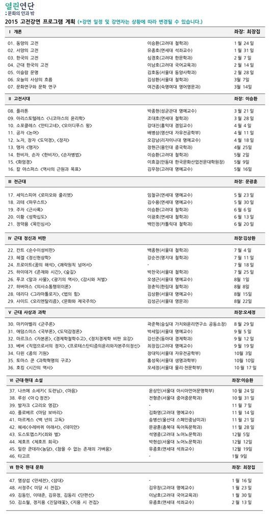 ‘문화의 안과 밖 : 오늘의 시대와 고전’ 강연은 7개 섹션, 총 50회 강연으로 구성된다.