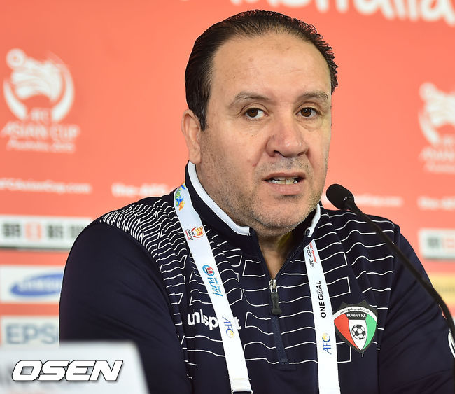 12일 오후(이하 한국시간) 호주 캔버라 스타디움에서 열린 쿠웨이트 축구대표팀 기자회견에서 나빌 말룰 쿠웨이트 감독이 질문에 답하고 있다.