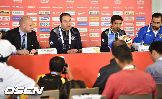 12일 오후(이하 한국시간) 호주 캔버라 스타디움에서 열린 쿠웨이트 축구대표팀 기자회견에서 나빌 말룰 쿠웨이트 감독이 질문에 답하고 있다.