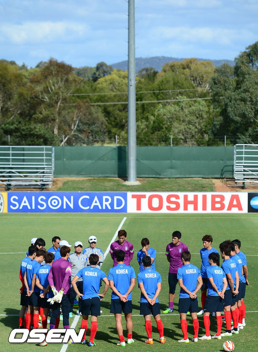 12일 오후(이하 한국시간) 호주 캔버라 맥켈러 파크에서 열린 한국 축구대표팀 훈련에서 대표팀 선수들이 미팅을 갖고 있다.