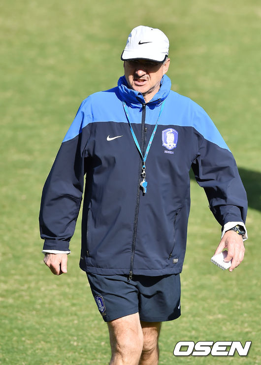 12일 오후(이하 한국시간) 호주 캔버라 맥켈러 파크에서 열린 한국 축구대표팀 훈련에서 슈틸리케 감독이 선수들에게 지시를 내리고 있다.