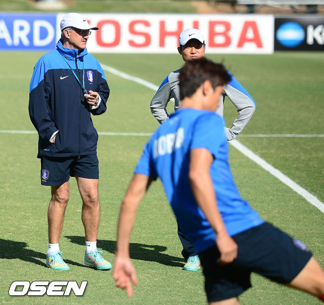 12일 오후(이하 한국시간) 호주 캔버라 맥켈러 파크에서 열린 한국 축구대표팀 훈련에서 슈틸리케 감독이 선수들의 훈련을 지켜보고 있다.
