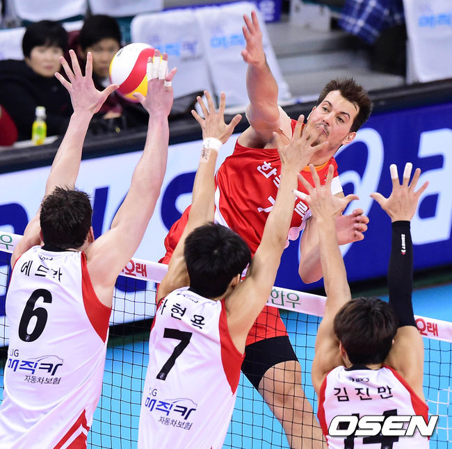 12일 오후 경북 구미시 박정희체육관에서 열린 '2014-2015 NH농협 V-리그' LIG 손해보험과 한국전력의 경기 1세트 쥬리치가 공격을 시도하고 있다.