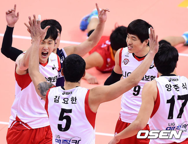 12일 오후 경북 구미시 박정희체육관에서 열린 '2014-2015 NH농협 V-리그' LIG 손해보험과 한국전력의 경기 1세트 LIG 선수들이 득점 후 기뻐하고 있다.