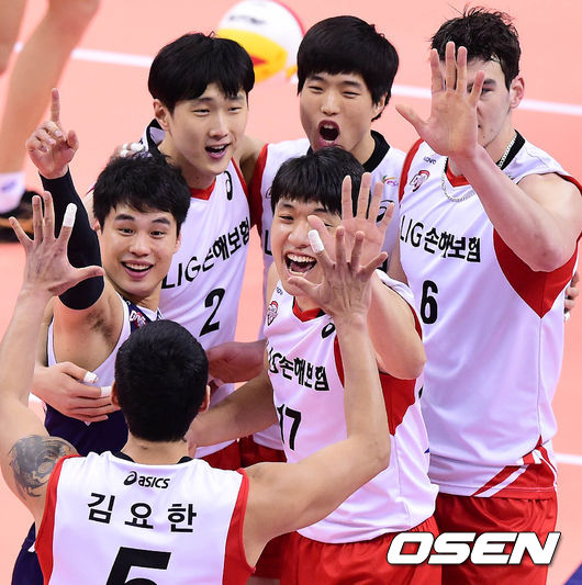 12일 오후 경북 구미시 박정희체육관에서 열린 '2014-2015 NH농협 V-리그' LIG 손해보험과 한국전력의 경기 1세트 LIG 선수들이 득점 후 기뻐하고 있다.